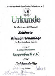 2022 erhielten wir den 1. Platz im Wettbewerb um die schönste Kleingartenanlage im Bezirksverbands Hameln.